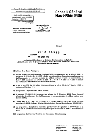 portant notification de la décision d'autorisation budgétaire et fixation du prix de journée 2012 du foyer d'accueil médicalisé du centre hospitalier de ROUFFACH. Resumé Pièces jointes ARRETE Assemblée : Non défini Date : 23/08/2012 Rapporteur : Non défini Collectivité : Conseil départemental du Haut-Rhin Direction : Non défini Service : Direction de l'Autonomie Domaine : Prix de Journée Commission :
