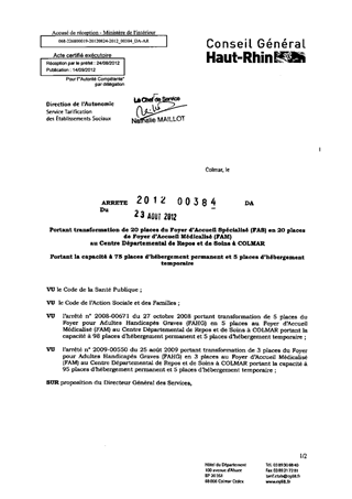 portant transformation de 20 places du foyer d'accueil spécialisé (FAS) en 20 places de foyer d'accueil médicalisé (FAM) au centre départemental de repos et de soins à COLMAR. Resumé Pièces jointes ARRETE Assemblée : Non défini Date : 23/08/2012 Rapporteur : Non défini Collectivité : Conseil départemental du Haut-Rhin Direction : Non défini Service : Direction de l'Autonomie Domaine : Autres (non classés) Commission :