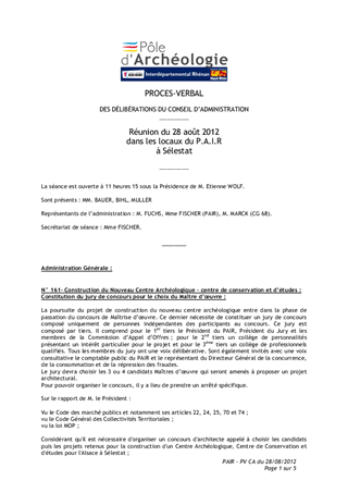 procès-verbal des délibérations du Conseil d'Administration de la réunion du 28 août 2012. Resumé Pièces jointes ARRETE Assemblée : Non défini Date : 28/08/2012 Rapporteur : Non défini Collectivité : Conseil départemental du Haut-Rhin Direction : Non défini Service : Direction de la Culture et du Patrimoine Domaine : Autres (non classés) Commission :