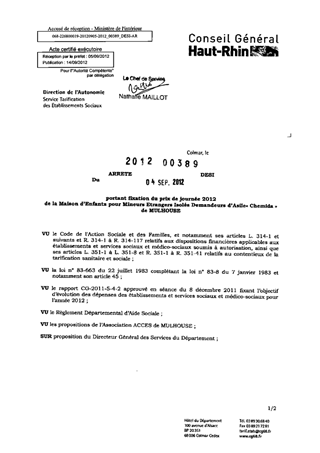 portant fixation du prix de journée 2012 de la maison d'enfants pour mineurs étrangers isolés demandeurs d'asile "Chemida" de MULHOUSE. Resumé Pièces jointes ARRETE Assemblée : Non défini Date : 04/09/2012 Rapporteur : Non défini Collectivité : Conseil départemental du Haut-Rhin Direction : Non défini Service : Direction de l'Autonomie Domaine : Prix de Journée Commission :