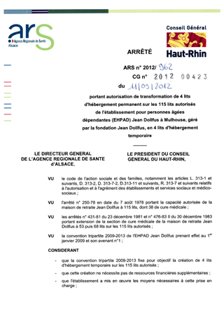 portant autorisation de transformation de 4 lits d'hébergement permanent sur les 115 lits autorisés de l'établissement pour personnes âgées dépendantes (EHPAD) Jean Dollfus à MULHOUSE, géré par la fondation Jean Dollfus, en 4 lits d'hébergement temporaire