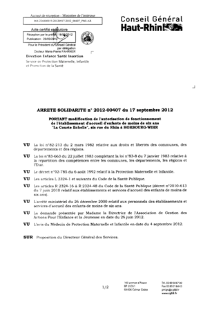 portant modification de l'autorisation de fonctionnement de l'établissement d'accueil d'enfants de moins de six ans "La Courte Echelle", sis rue du Rhin à HORBOURG-WIHR. Resumé Pièces jointes ARRETE Assemblée : Non défini Date : 17/09/2012 Rapporteur : Non défini Collectivité : Conseil départemental du Haut-Rhin Direction : Non défini Service : Direction Enfance Santé Insertion Domaine : Accueil d'enfants Commission :
