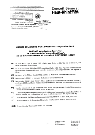 portant autorisation d'ouverture de la micro-crèche "Atouts Bout-Chou", sis au 8 rue du Sénateur Ritzenthaler à HOLTZWIHR (68320). Resumé Pièces jointes ARRETE Assemblée : Non défini Date : 17/09/2012 Rapporteur : Non défini Collectivité : Conseil départemental du Haut-Rhin Direction : Non défini Service : Direction Enfance Santé Insertion Domaine : Autres (non classés) Commission :