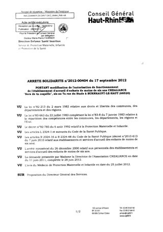 portant modification de l'autorisation de fonctionnement de l'établissement d'accueil d'enfants de moins de six ans Créaliance "Sors de ta coquille", si au 7a rue du Stade à BURNHAUPT-LE-HAUT (68520). Resumé Pièces jointes ARRETE Assemblée : Non défini Date : 17/09/2012 Rapporteur : Non défini Collectivité : Conseil départemental du Haut-Rhin Direction : Non défini Service : Direction Enfance Santé Insertion Domaine : Accueil d'enfants Commission :