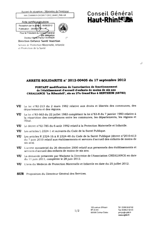 portant modification de l'autorisation de fonctionnement de l'établissement d'accueil d'enfants de moins de six ans Créaliance "La Ribandoll", sis au 27a Gra,d'Rue à SENTHEIM (68780). Resumé Pièces jointes ARRETE Assemblée : Non défini Date : 17/09/2012 Rapporteur : Non défini Collectivité : Conseil départemental du Haut-Rhin Direction : Non défini Service : Direction Enfance Santé Insertion Domaine : Accueil d'enfants Commission :