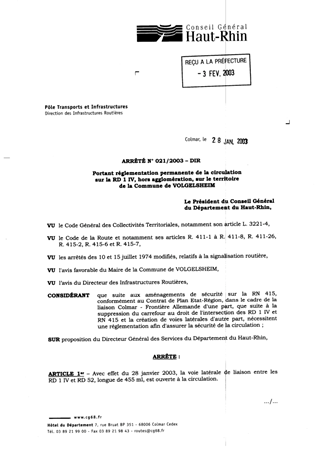 portant réglementation permanente de la circulation sur la RD 1 IV, hors agglomération, sur le territoire de la commune de Volgelsheim. Resumé Pièces jointes ARRETE Assemblée : Non défini Date : 28/01/2003 Rapporteur : Non défini Collectivité : Conseil départemental du Haut-Rhin Direction : Non défini Service : Direction des Routes Domaine : Circulation Commission :