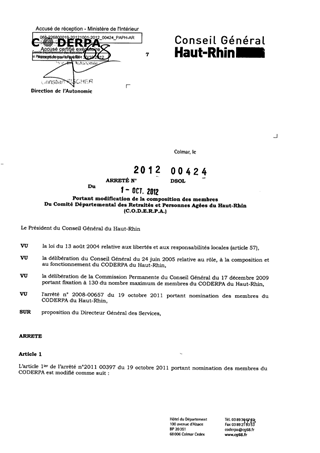 portant modification de la composition des membres du Comité Départemental des Retraités et Personnes Agées du Haut-Rhin (C.O.D.E.R.P.A.). Resumé Pièces jointes ARRETE Assemblée : Non défini Date : 01/10/2012 Rapporteur : Non défini Collectivité : Conseil départemental du Haut-Rhin Direction : Non défini Service : Direction de l'Autonomie Domaine : Autres (non classés) Commission :