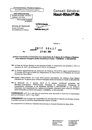 portant autorisation d'extension non importante de 4 places de la maison d'enfants pour mineurs étrangers isolés demandeurs d'asile "Chemida" à MULHOUSE. Resumé Pièces jointes ARRETE Assemblée : Non défini Date : 25/10/2012 Rapporteur : Non défini Collectivité : Conseil départemental du Haut-Rhin Direction : Non défini Service : Direction de l'Autonomie Domaine : Autres (non classés) Commission :
