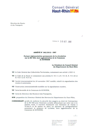 portant réglementation permanente de la circulation sur la RD 468, hors agglomération, de la commune de KUNHEIM. Resumé Pièces jointes ARRETE Assemblée : Non défini Date : 30/10/2012 Rapporteur : Non défini Collectivité : Conseil départemental du Haut-Rhin Direction : Non défini Service : Direction des Routes Domaine : Circulation Commission :