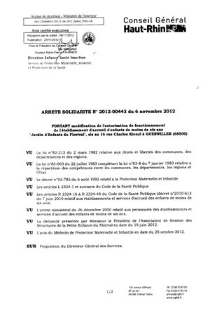 portant modification de l'autorisation de fonctionnement de l'établissement d'accueil d'enfants de moins de six ans "Jardin d'Enfants du Florival", sis au 16 rue Charles Kienzl à GUEBWILLER (68500). Resumé Pièces jointes ARRETE Assemblée : Non défini Date : 06/11/2012 Rapporteur : Non défini Collectivité : Conseil départemental du Haut-Rhin Direction : Non défini Service : Direction Enfance Santé Insertion Domaine : Accueil d'enfants Commission :