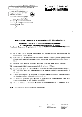 portant modification de l'autorisation de fonctionnement de l'établissement d'accueil d'enfants de moins des six ans "Les Petits Chaperons Rouges" sis au 41 rue du Vieil Armand à WITTENHEIM (68270). Resumé Pièces jointes ARRETE Assemblée : Non défini Date : 03/12/2012 Rapporteur : Non défini Collectivité : Conseil départemental du Haut-Rhin Direction : Non défini Service : Direction Enfance Santé Insertion Domaine : Accueil d'enfants Commission :