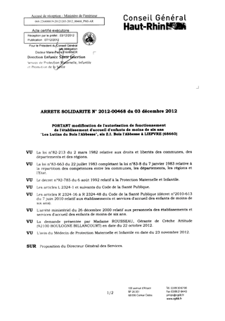 portant modification de l'autorisation de fonctionnement de l'établissement d'accueil d'enfants de moins de six ans "Les Lutins du Bois l'Abbesse" à LIEPVRE (68660). Resumé Pièces jointes ARRETE Assemblée : Non défini Date : 03/12/2012 Rapporteur : Non défini Collectivité : Conseil départemental du Haut-Rhin Direction : Non défini Service : Direction Enfance Santé Insertion Domaine : Accueil d'enfants Commission :