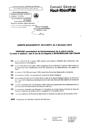 portant autorisation de fonctionnement de la micro-crèche "La Boîte à Malices", sise 8 rue de la Chapelle à BITSCHWILLER LES THANN. Resumé Pièces jointes ARRETE Assemblée : Non défini Date : 04/12/2012 Rapporteur : Non défini Collectivité : Conseil départemental du Haut-Rhin Direction : Non défini Service : Direction Enfance Santé Insertion Domaine : Autres (non classés) Commission :