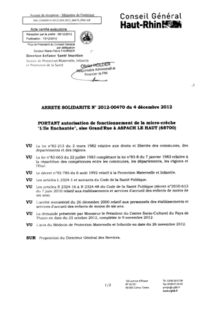 portant autorisation de fonctionnement de la micro-crèche "L'Ile Enchantée", sise Grand'Rue à ASPACH LE HAUT (68700). Resumé Pièces jointes ARRETE Assemblée : Non défini Date : 04/12/2012 Rapporteur : Non défini Collectivité : Conseil départemental du Haut-Rhin Direction : Non défini Service : Direction Enfance Santé Insertion Domaine : Autres (non classés) Commission :