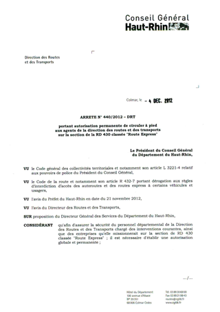 portant autorisation permanente de circuler à pied aux agents de la direction des routes et des transports sur la section de la RD 430 classée "Route Express". Resumé Pièces jointes ARRETE Assemblée : Non défini Date : 04/12/2012 Rapporteur : Non défini Collectivité : Conseil départemental du Haut-Rhin Direction : Non défini Service : Direction des Routes Domaine : Circulation Commission :