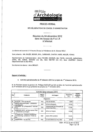 Procès-verbal des délibérations du Conseil d'Administration du 04.12.2012 Resumé Pièces jointes ARRETE Assemblée : Non défini Date : 04/12/2012 Rapporteur : Non défini Collectivité : Conseil départemental du Haut-Rhin Direction : Non défini Service : Direction Générale Adjointe de l'éducation et de la culture, du développement et de l'aménagement des territoires et des infrastructures Domaine : Autres (non classés) Commission :