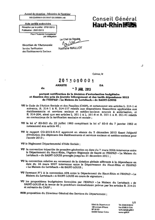 portant notification de la décision d'autorisation budgétaire et fixation des prix de journée hébergement et des tarifs dépendance 2013 de l'EHPAD "La Maison du Lertzbach" de SAINT-LOUIS. Resumé Pièces jointes ARRETE Assemblée : Non défini Date : 03/01/2013 Rapporteur : Non défini Collectivité : Conseil départemental du Haut-Rhin Direction : Non défini Service : Direction de l'Autonomie Domaine : Prix de Journée Commission :