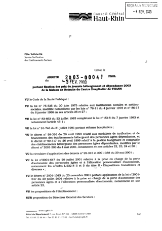 portant fixation des prix de journée hébergement et dépendance 2003 de la maison de retraite du centre hospitalier de THANN. Resumé Pièces jointes ARRETE Assemblée : Non défini Date : 03/02/2003 Rapporteur : Non défini Collectivité : Conseil départemental du Haut-Rhin Direction : Non défini Service : Direction de la Solidarité Domaine : Prix de Journée Commission :