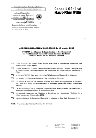 portant modification de l'autorisation de fonctionnement de l'établissement d'accueil d'enfants de moins de six ans "Le Chat Botté", sis rue du Faudé à ORBEY. Resumé Pièces jointes ARRETE Assemblée : Non défini Date : 18/01/2013 Rapporteur : Non défini Collectivité : Conseil départemental du Haut-Rhin Direction : Non défini Service : Direction Enfance Santé Insertion Domaine : Accueil d'enfants Commission :