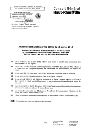 portant modification de l'autorisation de fonctionnement del'établissement d'accueil d'enfants de moins de six ans "Le Petit Poucet", sis au 1 rue du Vallon à SIGOLSHEIM. Resumé Pièces jointes ARRETE Assemblée : Non défini Date : 18/01/2013 Rapporteur : Non défini Collectivité : Conseil départemental du Haut-Rhin Direction : Non défini Service : Direction Enfance Santé Insertion Domaine : Accueil d'enfants Commission :