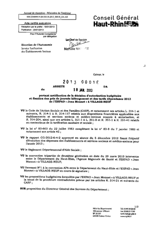 portant notification de la décision d'autorisation budgétaire et fixation des prix de journée hébergement et des tarifs dépendance 2013 de l'EHPAD "Jean Monnet" à VILLAGE-NEUF. Resumé Pièces jointes ARRETE Assemblée : Non défini Date : 18/01/2013 Rapporteur : Non défini Collectivité : Conseil départemental du Haut-Rhin Direction : Non défini Service : Direction de l'Autonomie Domaine : Prix de Journée Commission :