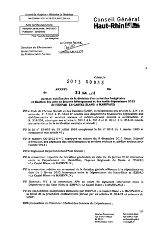 portant notification de la décision d'autorisation budgétaire et fixation des prix de journée hébergement et des tarifs dépendance 2013 de l'EHPAD "Le Castel Blanc" à MASEVAUX. Resumé Pièces jointes ARRETE Assemblée : Non défini Date : 23/01/2013 Rapporteur : Non défini Collectivité : Conseil départemental du Haut-Rhin Direction : Non défini Service : Direction de l'Autonomie Domaine : Prix de Journée Commission :
