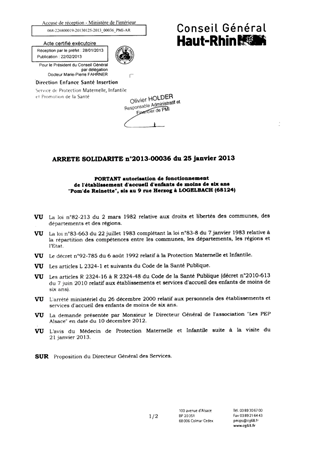 portant autorisation de fonctionnement de l'établissement d'accueil d'enfants de moins de six ans "Pom'de Reinette", sis au 9 rue Herzog à LOGELBACH (68124). Resumé Pièces jointes ARRETE Assemblée : Non défini Date : 25/01/2013 Rapporteur : Non défini Collectivité : Conseil départemental du Haut-Rhin Direction : Non défini Service : Direction Enfance Santé Insertion Domaine : Accueil d'enfants Commission :