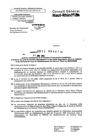 portant notification de la décision d'autorisation budgétaire et fixation des prix de journée hébergement et des tarifs dépendance 2013 de l'EHPAD et de l'accueil de jour de l'établissement du Docteur Thuet de ENSISHEIM. Resumé Pièces jointes ARRETE Assemblée : Non défini Date : 31/01/2013 Rapporteur : Non défini Collectivité : Conseil départemental du Haut-Rhin Direction : Non défini Service : Direction de l'Autonomie Domaine : Prix de Journée Commission :