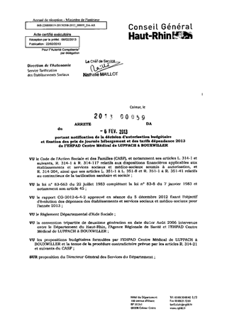portant notification de la décision d'autorisation budgétaire et fixation des prix de journée hébergement et des tarifs dépendance 2013 de l'EHPAD Centre Médical de LUPPACH à BOUXWILLER. Resumé Pièces jointes ARRETE Assemblée : Non défini Date : 06/02/2013 Rapporteur : Non défini Collectivité : Conseil départemental du Haut-Rhin Direction : Non défini Service : Direction de l'Autonomie Domaine : Prix de Journée Commission :