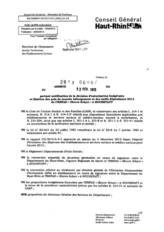 portant notification de la décision d'autorisation budgétaire et fixation des prix de journée hébergement et des tarifs dépendance 2013 de l'EHPAD "Oeuvre Schyrr" à HOCHSTATT. Resumé Pièces jointes ARRETE Assemblée : Non défini Date : 12/02/2013 Rapporteur : Non défini Collectivité : Conseil départemental du Haut-Rhin Direction : Non défini Service : Direction de l'Autonomie Domaine : Prix de Journée Commission :