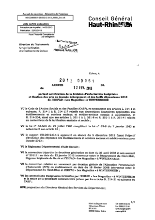 portant notification de la décision d'autorisation budgétaire et fixation des prix de journée hébergement et des tarifs dépendance 2013 de l'EHPAD "Les Magnolias" à WINTZENHEIM. Resumé Pièces jointes ARRETE Assemblée : Non défini Date : 12/02/2013 Rapporteur : Non défini Collectivité : Conseil départemental du Haut-Rhin Direction : Non défini Service : Direction de l'Autonomie Domaine : Prix de Journée Commission :