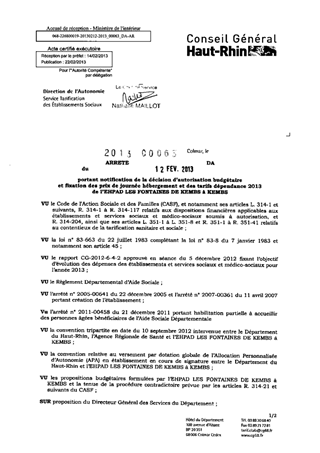 portant notification de la décision d'autorisation budgétaire et fixation des prix de journée hébergement et des tarifs dépendance 2013 de l'EHPAD "Les Fontaines de Kembs" à KEMBS. Resumé Pièces jointes ARRETE Assemblée : Non défini Date : 12/02/2013 Rapporteur : Non défini Collectivité : Conseil départemental du Haut-Rhin Direction : Non défini Service : Direction de l'Autonomie Domaine : Prix de Journée Commission :