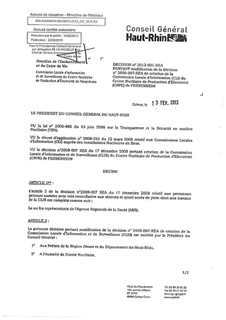 décision portant modification de la décision n° 2008-007-SEA de création de la Commission Locale d'Insertion (CLI) du Centre Nucléaire de Production d'Electricité (CNPE) de FESSENHEIM. Resumé Pièces jointes ARRETE Assemblée : Non défini Date : 13/02/2013 Rapporteur : Non défini Collectivité : Conseil départemental du Haut-Rhin Direction : Non défini Service : Direction de l'Environnement et du Cadre de Vie Domaine : Autres (non classés) Commission :