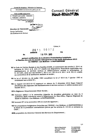 portant notification de la décision d'autorisation budgétaire et fixation des prix de journée hébergement et des tarifs dépendance 2013 de l'EHPAD "Les Molènes" à BANTZENHEIM. Resumé Pièces jointes ARRETE Assemblée : Non défini Date : 18/02/2013 Rapporteur : Non défini Collectivité : Conseil départemental du Haut-Rhin Direction : Non défini Service : Direction de l'Autonomie Domaine : Prix de Journée Commission :