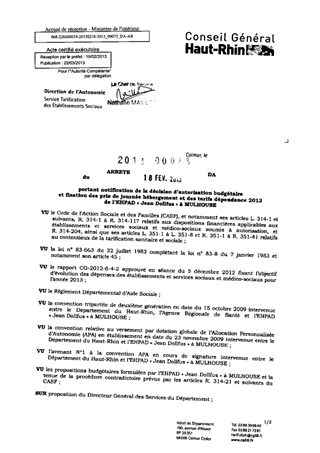 portant notification de la décision d'autorisation budgétaire et fixation des prix de journée hébergement et des tarifs dépendance 2013 de l'EHPAD "Jean Dollfus" à MULHOUSE Resumé Pièces jointes ARRETE Assemblée : Non défini Date : 18/02/2013 Rapporteur : Non défini Collectivité : Conseil départemental du Haut-Rhin Direction : Non défini Service : Direction de l'Autonomie Domaine : Prix de Journée Commission :