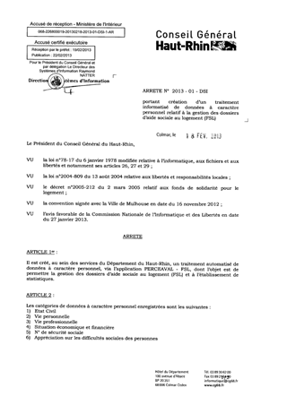 portant création d'un traitement informatisé de données à caractère personnel relatif à la gestion des dossiers d'aide sociale au logement (FSL). Resumé Pièces jointes ARRETE Assemblée : Non défini Date : 18/02/2013 Rapporteur : Non défini Collectivité : Conseil départemental du Haut-Rhin Direction : Non défini Service : Direction des Systèmes d'Information Domaine : Informatique Commission :