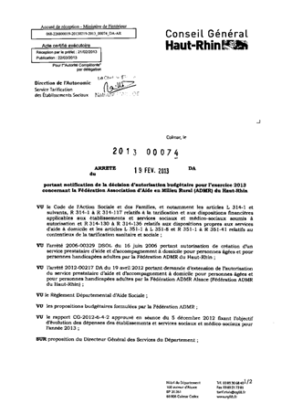 portant notification de la décision d'autorisation budgétaire pour l'exercice 2013 concernant la Fédération Association d'Aide en Milieu Rural (ADMR) du Haut-Rhin. Resumé Pièces jointes ARRETE Assemblée : Non défini Date : 19/02/2013 Rapporteur : Non défini Collectivité : Conseil départemental du Haut-Rhin Direction : Non défini Service : Direction de l'Autonomie Domaine : Dotations financières Commission :