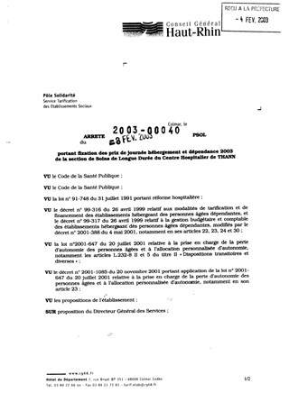 portant fixation des prix de journée hébergement et dépendance 2003 de la section des soins de longue durée du centre hospitalier de THANN. Resumé Pièces jointes ARRETE Assemblée : Non défini Date : 03/02/2003 Rapporteur : Non défini Collectivité : Conseil départemental du Haut-Rhin Direction : Non défini Service : Direction de la Solidarité Domaine : Prix de Journée Commission :