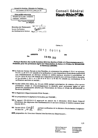 portant fixation des tarifs horaires 2013 du service d'aide et d'accompagnement à domicile pour les personnes âgées de l'Association de soins et d'aides de MULHOUSE et Environs (ASAME). Resumé Pièces jointes ARRETE Assemblée : Non défini Date : 19/02/2013 Rapporteur : Non défini Collectivité : Conseil départemental du Haut-Rhin Direction : Non défini Service : Direction de l'Autonomie Domaine : Prix de Journée Commission :