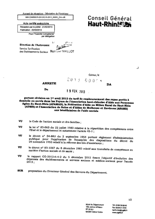 portant révision au 1er avril 2013 du tarif de remboursement des repas portés à domicile ou servis dans les foyers de l'association haut-rhinoise d'aide aux personnes âgées du Haut-Rhin (APAMAD), la fédération d'aide en milieu rural du Haut-Rhin (ADMR) et