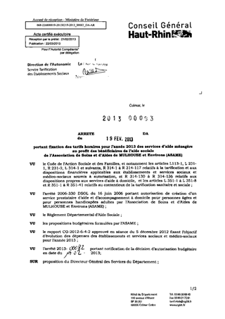 portant fixation des tarifs horaires pour l'année 2013 des services d'aide ménagère au profit des bénéficiaires de l'aide sociale de l'Association de Soins et d'Aides de MULHOUSE et Environs (ASAME). Resumé Pièces jointes ARRETE Assemblée : Non défini Date : 19/02/2013 Rapporteur : Non défini Collectivité : Conseil départemental du Haut-Rhin Direction : Non défini Service : Direction de l'Autonomie Domaine : Dotations financières Commission :