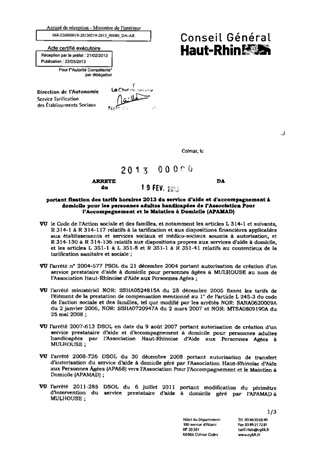 portant fixation des tarifs horaires 2013 du service d'aide et d'accompagnement à domicile pour les personnes adultes handicapées de l'Association pour l'Accompagnement et le Maintien à Domicile (APAMAD). Resumé Pièces jointes ARRETE Assemblée : Non défini Date : 19/02/2013 Rapporteur : Non défini Collectivité : Conseil départemental du Haut-Rhin Direction : Non défini Service : Direction de l'Autonomie Domaine : Prix de Journée Commission :
