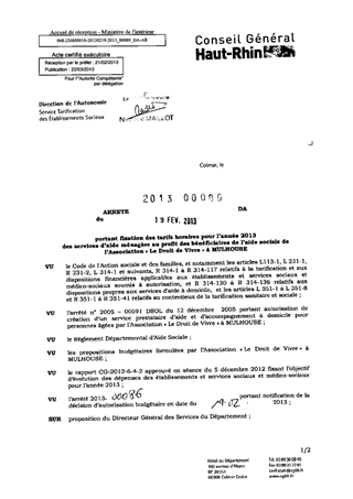 portant fixation des tarfis horaires pour l'année 2013 des services d'aide ménagère au profit des bénéficiaires de l'aide sociale de l'Association "Le Droit de Vivre" à MULHOUSE. Resumé Pièces jointes ARRETE Assemblée : Non défini Date : 19/02/2013 Rapporteur : Non défini Collectivité : Conseil départemental du Haut-Rhin Direction : Non défini Service : Direction de l'Autonomie Domaine : Prix de Journée Commission :