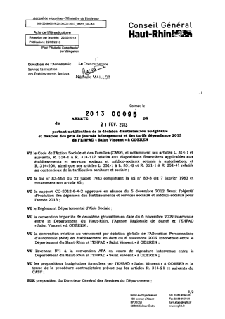 portant notification de la décision d'autorisation budgétaire et fixation des prix de journée hébergement et des tarifs dépendance 2013 de l'EHPAD "Saint Vincent" à ODEREN. Resumé Pièces jointes ARRETE Assemblée : Non défini Date : 21/02/2013 Rapporteur : Non défini Collectivité : Conseil départemental du Haut-Rhin Direction : Non défini Service : Direction de l'Autonomie Domaine : Prix de Journée Commission :