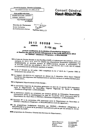 portant notification de la décision d'autorisation budgétaire et fixation des prix de journée hébergement et des tarifs dépendance 2013 de l'EHPAD "Résidence d'Argenson" à BOLLWILLER.