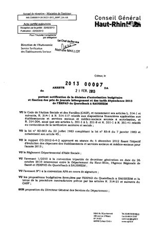 portant notification de la décision d'autorisation budgétaire et fixation des prix de journée hébergement et des tarifs dépendance 2013 de l'EHPAD du Quatelbach à SAUSHEIM. Resumé Pièces jointes ARRETE Assemblée : Non défini Date : 21/02/2013 Rapporteur : Non défini Collectivité : Conseil départemental du Haut-Rhin Direction : Non défini Service : Direction de l'Autonomie Domaine : Prix de Journée Commission :