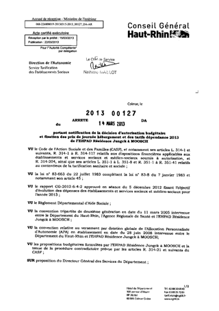 portant notification de la décision d'autorisation budgétaire et fixation des prix de journée hébergement et des tarifs dépendance 2013 de l'EHPAD Résidence Jungck à MOOSCH. Resumé Pièces jointes ARRETE Assemblée : Non défini Date : 14/03/2013 Rapporteur : Non défini Collectivité : Conseil départemental du Haut-Rhin Direction : Non défini Service : Direction de l'Autonomie Domaine : Prix de Journée Commission :
