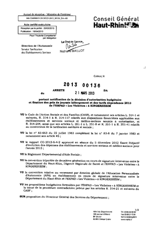 portant notification de la décision d'autorisation budgétaire et fixation des prix de journée hébergement et des tarifs dépendance 2013 de l'EHPAD "Les Violettes" à KINGERSHEIM. Resumé Pièces jointes ARRETE Assemblée : Non défini Date : 21/03/2013 Rapporteur : Non défini Collectivité : Conseil départemental du Haut-Rhin Direction : Non défini Service : Direction de l'Autonomie Domaine : Prix de Journée Commission :