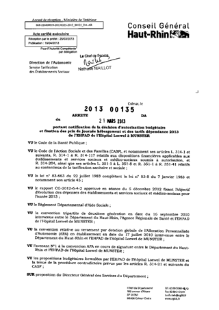 portant notification de la décision d'autorisation budgétaire et fixation des prix de journée hébergement et des tarifs dépendance 2013 de l'EHPAD de l'hôpital Loewel à MUNSTER. Resumé Pièces jointes ARRETE Assemblée : Non défini Date : 21/03/2013 Rapporteur : Non défini Collectivité : Conseil départemental du Haut-Rhin Direction : Non défini Service : Direction de l'Autonomie Domaine : Prix de Journée Commission :