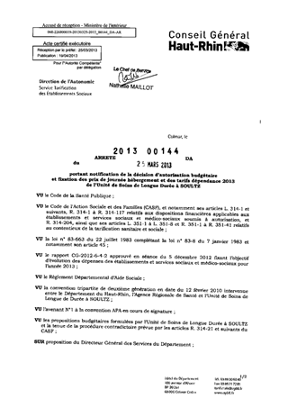 portant notification de la décision d'autorisation budgétaire et fixation des prix de journée hébergement et des tarifs dépendance 2013 de l'unité de soins de longue durée à SOULTZ. Resumé Pièces jointes ARRETE Assemblée : Non défini Date : 25/03/2013 Rapporteur : Non défini Collectivité : Conseil départemental du Haut-Rhin Direction : Non défini Service : Direction de l'Autonomie Domaine : Prix de Journée Commission :
